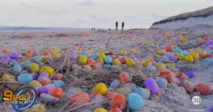 ไข่พลาสติกหลากสีสันถูกคลื่นซัดเข้ามาติดอยู่บนชายหาดเกาะลังอุ๊กของเยอรมนี ภายในไข่มีของเล่นชิ้นเล็กๆ บรรจุเอาไว้ สร้างความตื่นเต้นให้แก่ผู้พบเห็น