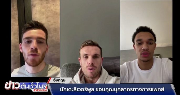แอนดรูว์ โรเบิร์ตสัน, จอร์แดน เฮนเดอร์สัน และเทรนต์ อเล็กซานเดอร์-อาร์โนลด์” 3 นักเตะลิเวอร์พูล ส่งคลิปขอบคุณเจ้าหน้าที่ด้านสาธารณสุขของอังกฤษ โดยสโมสรลิเวอร์พูลยังส่งกระเช้าช็อกโกแลต 200 ชุด เป็นกำลังใจให้บุคลาการทางการแพทย์ด้วย