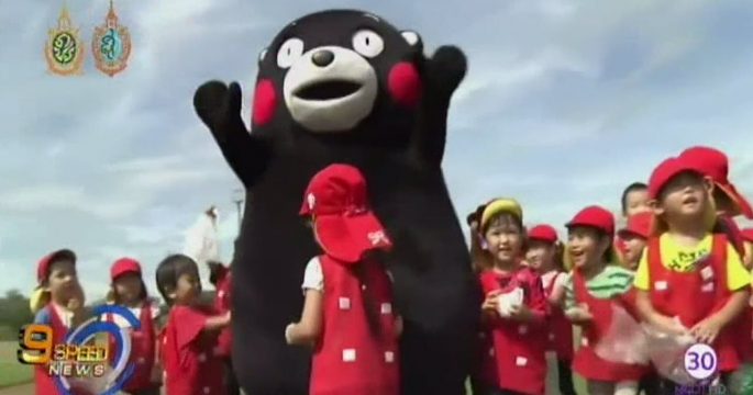 ศิลปินชาวญี่ปุ่นตัดหญ้าในสวนสาธารณะแห่งหนึ่ง ของจังหวัดคุมาโมโตะ เป็นรูปหมีคุมะมงสัตว์สัญลักษณ์ของจังหวัด กำลังก้มหัวพร้อมข้อความขอบคุณผู้ช่วยเหลือ