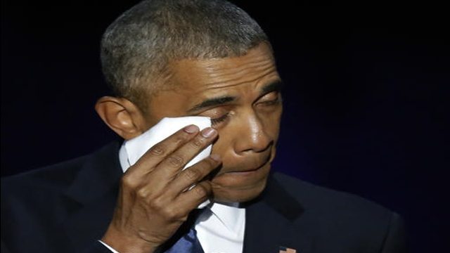 ประธานาธิบดีบารัค โอบามาของสหรัฐปาดน้ำตาขณะกล่าวขอบคุณมิเชล โอบามา ผู้เป็นภรรยาและบุตรสาวทั้งสองคนระหว่างการกล่าวสุนทรพจน์อำลาตำแหน่ง