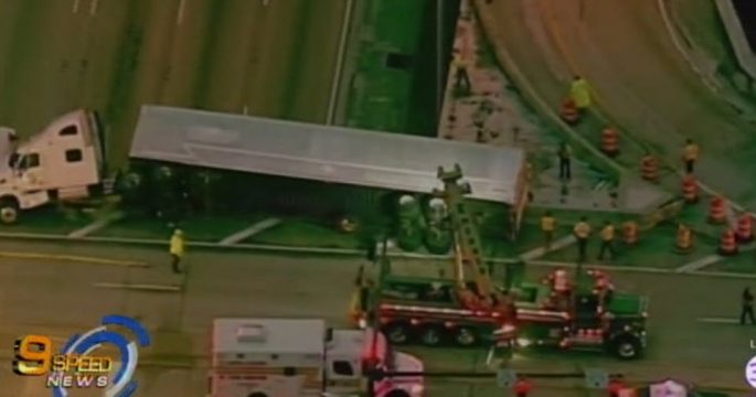 รถบรรทุกพ่วงพุ่งชนขอบราวสะพานข้ามทางหลวงระหว่างรัฐสายที่ 95 ในรัฐฟลอริดา ทำให้คนงานประจำรถบรรทุกวัย 69 ปี ตกจากสะพานเสียชีวิต