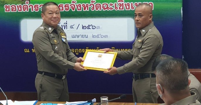 “ส.ต.อ.” สังกัดสันติบาลถูกนำตัวส่งศาลจังหวัดฉะเชิงเทราขอฝากขัง หลังถูกรวบวานนี้ขณะเตรียมก่อเหตุจี้ธนาคาร ด้าน ผบก.ภ.จว.มอบประกาศเกียรติคุณรอง สว.ป.-ดาบตำรวจ สภ.บางปะกง สกัดเหตุไว้ได้ทัน