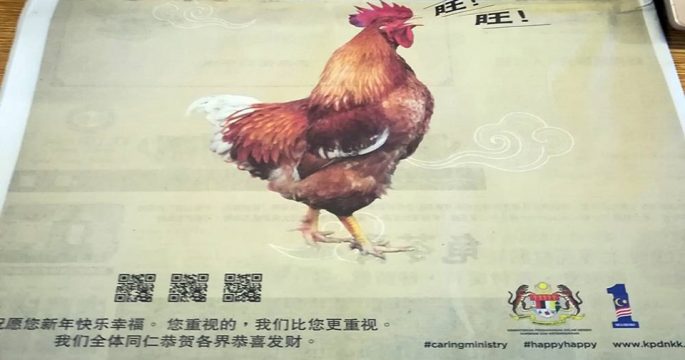 มาเลเซียแถลงขอโทษภายหลังจากโฆษณาประชาสัมพันธ์ของรัฐบาลที่ลงในหนังสือพิมพ์ภาษาจีนเป็นภาพไก่แจ้เห่ารับตรุษจีนปีจอ ซึ่งทำให้เกิดเสียงวิจารณ์ล้อเลียนตามมา