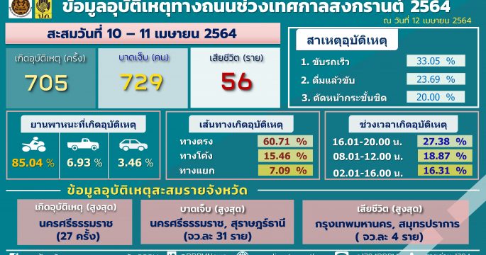 ศปถ. เผยสถิติอุบัติเหตุ 3 วันแรกของการรณรงค์ “ขับขี่ปลอดภัย เมืองไทยไร้อุบัติเหตุ” พบสงกรานต์นี้เกิดอุบัติเหตุรวม 756 ครั้ง มีผู้เสียชีวิตแล้ว 100 ราย บาดเจ็บ 752 คน โดยรถจักรยานยนต์เกิดเหตุสูงสุด ขณะที่พฤติกรรมเสี่ยงอันดับต้นยังคงเป็น “ไม่สวมหมวกนิรภัย” และ “ดื่มแล้วขับ” ล่าสุดพบการ “กินยาออกฤทธิ์ง่วง”