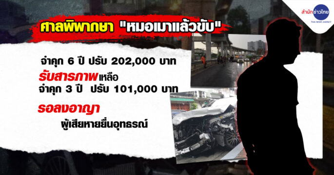 ศาลสั่งจำคุก 6 ปี ปรับ 202,000 บาท หมอเมาซิ่งรถหรู ชนเก๋ง ดับ 2 สาหัส 1 ให้การสารภาพเป็นประโยชน์ลดโทษให้กึ่งหนึ่ง เหลือคุก 3 ปี ปรับ 101,000 บาท โทษจำคุกรอลงอาญา 2 ปี ลูกชายผู้ตายเตรียมยื่นอุทธรณ์
