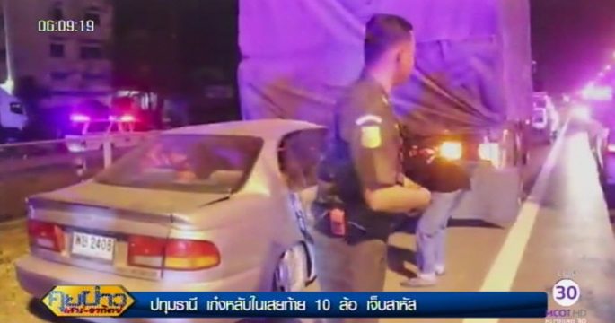 หนุ่มขับเก๋งหลับใน อัดท้ายรถสิบล้อถนนวงแหวนกาญจนาภิเษกฝั่งตะวันออก ต.คลองสี่ อ.คลองหลวง จ.ปทุมธานี บาดเจ็บสาหัส