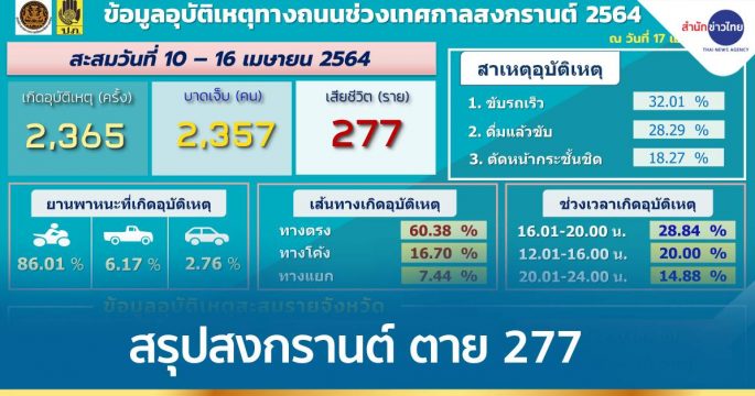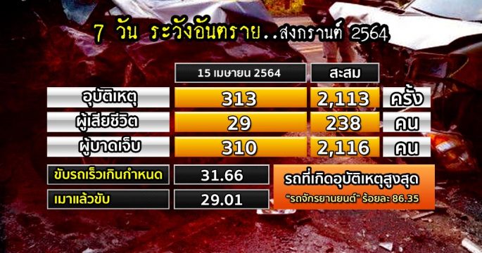 อุบัติเหตุทางถนนสะสมช่วง 6 วันของการรณรงค์ นับตั้งแต่วันที่ 10 เมษายน ถึงเมื่อวานนี้ เกิดอุบัติเหตุรวม 2,113 ครั้ง ผู้เสียชีวิตรวม 238 คน ผู้บาดเจ็บ รวม 2,116 คน สาเหตุหลักเกิดจากขับรถเร็ว