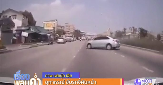 เป็นภาพของรถเก๋งคันหนึ่งขับจี้ท้ายรถคันหน้าด้วยความเร็ว บนถนนที่อยู่ในช่วงโค้ง ก่อนที่รถตัวเองจะเสียหลักหมุนเคว้ง และไปรถที่จอดอยู่ริมถนน ทำให้มีชาวบ้านที่ยืนอยู่ข้างทางได้รับบาดเจ็บ