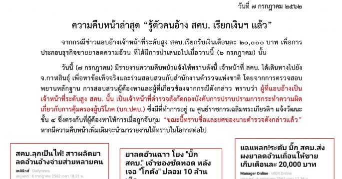 สคบ. ชี้แจง เรียกรายเดือน 20,000 บาท ขายยาลดความอ้วน ยืนยัน เจ้าหน้าที่ สคบ.ไม่มีส่วนเกี่ยวข้องแต่อย่างใด แต่เป็นเจ้าหน้าที่ตำรวจ บก.ปคบ.