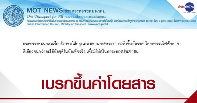 ก.คมนาคม เรียกร้องให้ กทม.ชะลอการปรับขึ้นอัตราค่าโดยสารรถไฟฟ้าสายสีเขียว จนกว่าจะได้ข้อยุติในข้อเท็จจริง เพื่อมิให้เป็นภาระของประชาชน