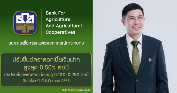 ธ.ก.ส. ปรับขึ้นดอกเบี้ยเงินฝาก สูงสุดร้อยละ 0.50 ต่อปี และดอกเบี้ยเงินกู้ทุกประเภท ร้อยละ 0.01-0.25 ต่อปี สอดคล้องกับทิศทางอัตราดอกเบี้ยในตลาด มีผล 6 มิ.ย.66