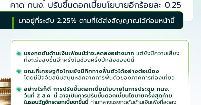 ศูนย์วิจัยกสิกรไทย ระบุการประชุม กนง. วันที่ 2 ส.ค.66 คาด กนง. ปรับขึ้นดอกเบี้ยนโยบายอีกร้อยละ 0.25 มาอยู่ที่ระดับ 2.25% และอาจขึ้นครั้งสุดท้ายในรอบวัฏจักรดอกเบี้ยขาขึ้นนี้