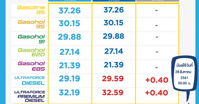 ปตท.ปรับขึ้นดีเซล 40 สตางค์ต่อลิตร ส่วนชนิดอื่นคงเดิม มีผล 28 ส.ค.นี้