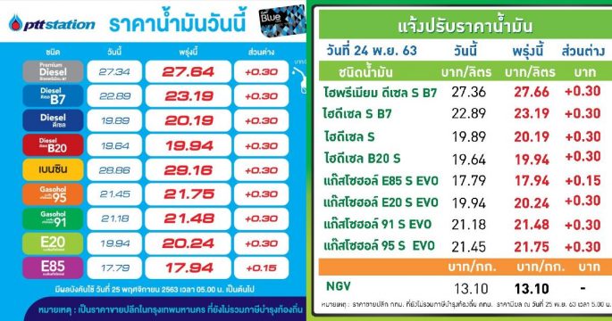 PTT Station บางจากฯ ปรับราคาขายปลีกน้ำมันทุกชนิดขึ้น 0.30 บาทต่อลิตร เว้น E85 ปรับขึ้น 0.15 บาทต่อลิตร มีผล 25 พ.ย. 2563 เวลา 05.00 น. เป็นต้นไป