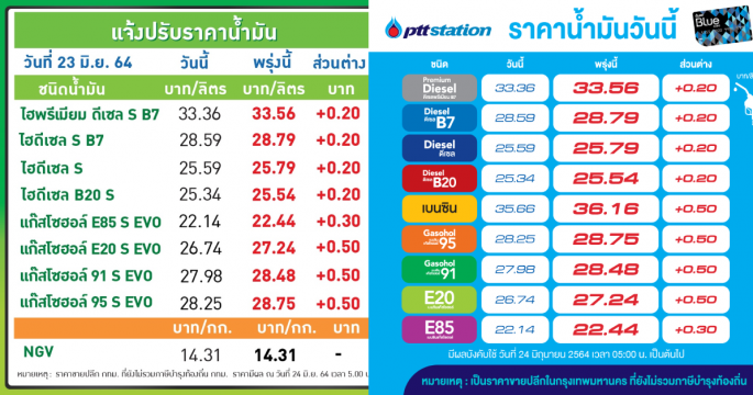 PTT Station บางจากฯ ปรับราคาขายปลีกน้ำมันกลุ่มเบนซินและแก๊สโซฮอล์ทุกชนิดขึ้น 0.50 บาทต่อลิตร เว้น E85 ปรับขึ้น 0.30 บาทต่อลิตร ส่วนกลุ่มดีเซลทุกชนิด ปรับขึ้น 0.20 บาท ต่อลิตร มีผล 24 มิ.ย.64 เวลา 05.00 น. เป็นต้นไป