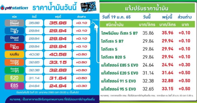 PTT Station บางจาก ปรับราคาขายปลีกน้ำมันเบนซินและแก๊สโซฮอล์ทุกชนิดขึ้น 0.50 บาทต่อลิตร เว้น E85 ปรับขึ้น 0.30 บาทต่อลิตร ส่วนกลุ่มดีเซลทุกชนิด ปรับขึ้น 0.10 บาทต่อลิตร มีผล 20 ม.ค.65 เวลา 05.00 น. เป็นต้นไป