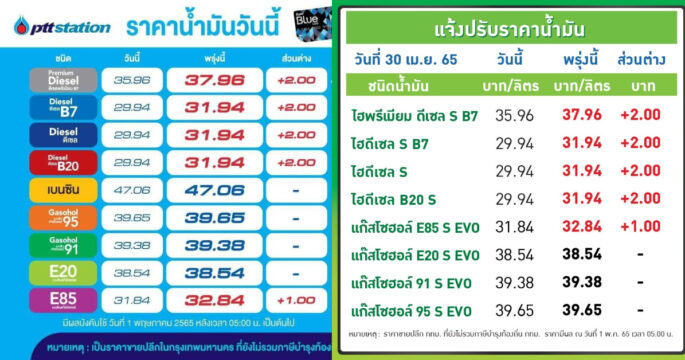 PTT Station – บางจากฯ ปรับราคาขายปลีกน้ำมันกลุ่มดีเซลทุกชนิดขึ้น 2 บาท/ลิตร ส่วน E85 ปรับขึ้น 1 บาท/ลิตร ส่วนกลุ่มเบนซินและแก๊สโซฮอล์ชนิดอื่น คงเดิม มีผล 1 พ.ค.65 เวลา 05.00 น. เป็นต้นไป