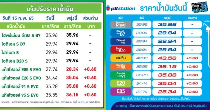 PTT Station บางจาก ปรับราคาขายปลีกน้ำมันเบนซินและแก๊สโซฮอล์ทุกชนิดขึ้น 0.60 บาทต่อลิตร ส่วนกลุ่มดีเซลทุกชนิดคงเดิม มีผล 16 ก.พ.65 เวลา 05.00 น. เป็นต้นไป