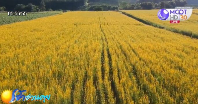 ชาวตำบลโป่งผา อ.แม่สาย จ.เชียงราย หนึ่งในเกษตรกรที่เช่าที่ดินของโรงงานยาสูบ หันมาปลูกปอเทืองในพื้นที่ 22 ไร่ หลังโรงงานยาสูบลดโควตาใบยาสูบ ตอนนี้ออกดอกเหลืองบานสะพรั่ง ตัดกับเทือกเขาขุนน้ำนางนอนที่เด่นตระหง่านอยู่เบื้องหลัง