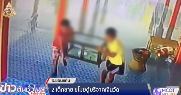 วงจรปิด ที่จับภาพขณะเด็กชาย 2 คน ก่อเหตุลักทรัพย์ตู้เงินบริจาค ในศาลาการเปรียญ วัดมุกดาราม อำเภอน้ำพอง จังหวัดขอนแก่น
