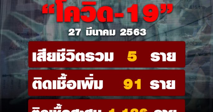 สถานการณ์โควิด-19 วันนี้ 27 มี.ค. 63 พบผู้ป่วยเพิ่ม 91 สะสม 1,136 ตายเพิ่ม 1 รวม 5 ราย
