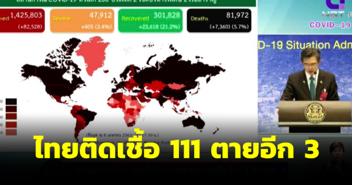 สถานการณ์โรคโควิด-19 ไทยพบติดเชื้อ 111 ราย เพิ่มขึ้นจากเมื่อวาน มีชาวต่างชาติตาย 3 ราย