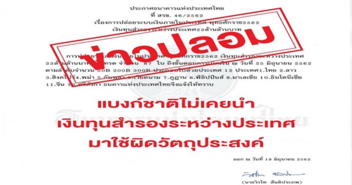 ธปท.ยันข่าวนำเงินทุนสำรองระหว่างประเทศมาใช้เป็นข่าวปลอม ชี้ไม่เคยนำเงินมาใช้ผิดวัตถุประสงค์