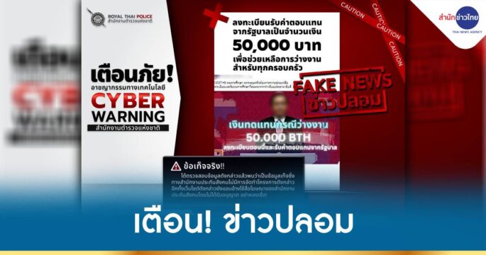 “ลูกขวัญ” รองโฆษก ตร. เตือน Fake news ลงทะเบียนรับค่าตอบแทนจากรัฐบาล จำนวน 50,000 บาท เพื่อช่วยเหลือการว่างงานสำหรับทุกครอบครัว ย้ำไม่มีการจัดทำโครงการดังกล่าว
