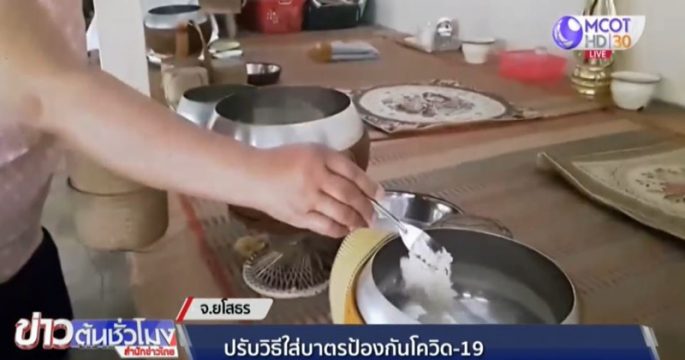 ชาวบ้านคำเกิด ต.กระจาย อ.ป่าติ้ว จ.ยโสธร ปรับวิธีการใส่บาตรพระสงฆ์ ด้วยการใช้ช้อนส้อมตักข้าวเหนียวจากกระติ๊บข้าวแทนการใช้มือ ป้องกันการแพร่ระบาดของโรคโควิด-19