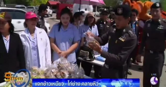 ตำรวจเขาสวนกวางไอเดียเก๋ แจกข้าวเหนียวไก่ย่างเขาสวนกวาง 500 กล่อง ให้ผู้ใช้รถใช้ถนน หน้าสภ.เขาสวนกวาง เพื่อคลายความความหิว ระหว่างการเดินทาง