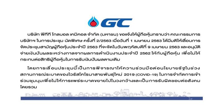 บอร์ด GC แจ้งเลื่อนประชุมผู้ถือหุ้นไม่มีกำหนด คงวันเวลาจ่ายปันผลเช่นเดิม