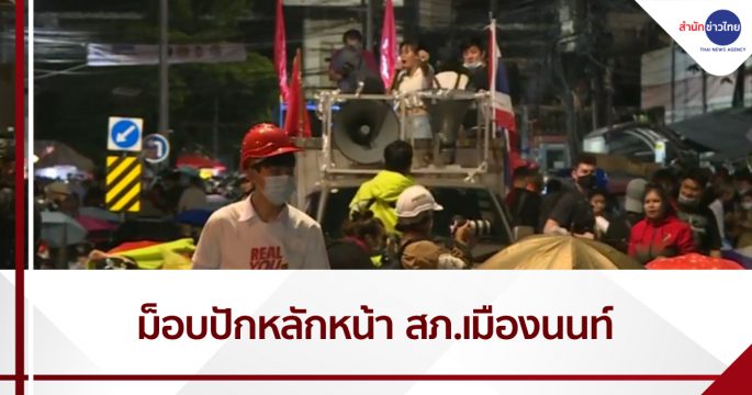 กลุ่มผู้ชุมนุมคณะราษฎร 2563 เดินเท้าระยะทางกว่า 4 กิโลเมตร มาปักหลักหน้าสถานีตำรวจภูธรเมืองนนทบุรี โดยเจ้าหน้าที่นำรั้วมากั้นไว้ไม่ให้เข้าไปภายใน