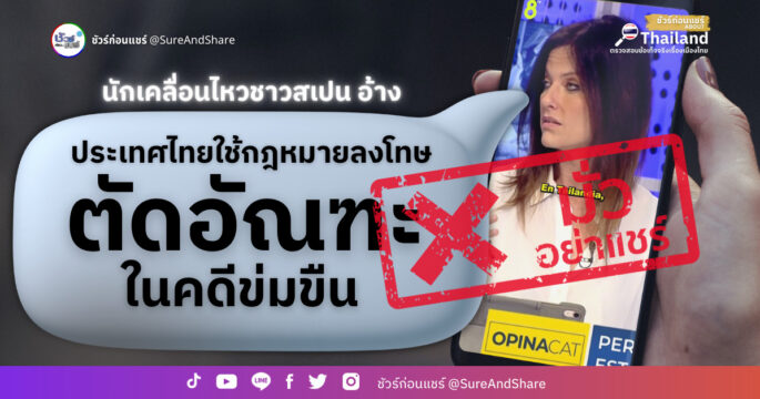 23 เมษายน 2566ชัวร์ก่อนแชร์ ABOUT🇹🇭Thailand | ตรวจสอบข้อเท็จจริงเรื่องเมืองไทยตรวจสอบข้อเท็จจริง โดย พีรพล อนุตรโสตถิ์ | ทำงานร่วมกับ Juan Piero Solis จาก Verificador, La República เปรู ตามที่นักเคลื่อนไหวทางการเมืองชาวสเปนคนหนึ่ง กล่าวในรายการโทรทัศน์เมื่อวันที่ 29 มีนาคม 2566 ระบุว่า “ในประเทศไทย หากผู้ชายพยายามข่มขืน หรือ ข่มขืนผู้หญิง ชายคนนั้นจะถูกตัดอัณฑะ (physically castrated)” ซึ่งมีการแชร์และการปฏิสัมพันธ์บน Twitter Instagram และ Tiktok กว่า 20,000 ครั้งนั้น บทสรุป ไม่จริง ❌ ไม่ควรแชร์ต่อ ศูนย์ชัวร์ก่อนแชร์ ได้รับการประสานตรวจสอบจาก Verificador หน่วยตรวจยืนยันข้อมูล ของสื่อ La República ในประเทศเปรู ว่า มีการกล่าวอ้างที่เกี่ยวข้องกับประเทศไทย โดยมีนักเคลื่อนไหวทางการเมืองสตรีชื่อ […]