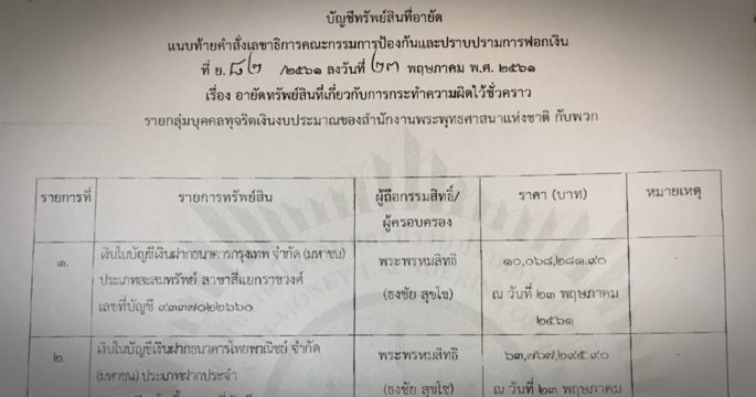 ปปง.อายัดทรัพย์สินอดีตพระชั้นผู้ใหญ่ที่ถูกดำเนินคดีเงินทอนวัด กว่า 10 รายการ รวมมูลค่ากว่า 134ล้านบาท