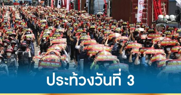 โซล 9 มิ.ย.-คนขับรถบรรทุกเกาหลีใต้หลายพันคนยังคงออกมาชุมนุมประท้วงที่ท่าเรือและสถานีตู้สินค้าหลายแห่งในเกาหลีใต้ติดต่อกันเป็นวันที่สาม เพื่อขัดขวางการส่งออกสินค้าไปต่างประเทศ ซึ่งทำให้หลายคนวิตกกังวลว่าอาจเกิดความเสี่ยงครั้งใหม่ต่อห่วงโซ่อุปทานทั่วโลกที่กำลังอยู่ในภาวะตึงตัว กระทรวงคมนาคมของเกาหลีใต้เผยวันนี้ว่า คนขับรถบรรทุกร้อยละ 30 ที่เป็นสมาชิกสหภาพแรงงานขนส่งสินค้าบรรทุกของเกาหลีใต้ได้ออกมาชุมนุมในวันนี้เป็นวันที่สามเพื่อเรียกร้องให้รัฐบาลขึ้นค่าจ้าง เนื่องจากประสบปัญหาราคาน้ำมันพุ่งสูงขึ้น ขณะที่ประธานาธิบดียุน ซอก-ยอล ของเกาหลีใต้ เตือนกลุ่มผู้ชุมนุมไม่ให้ใช้ความรุนแรง พร้อมทั้งกล่าวว่า รัฐบาลกำลังเร่งหาทางแก้ปัญหาดังกล่าวผ่านการเจรจาร่วมกับหลายฝ่าย ในขณะเดียวกัน กลุ่มอุตสาหกรรมยานยนต์ของเกาหลีใต้ได้ออกมาตำหนิการชุมนุมประท้วงของคนขับรถบรรทุกว่าเป็นการกระทำที่เห็นแก่ตัวอย่างมาก เนื่องจากการชุมนุมดังกล่าวจะยิ่งทำร้ายภาคอุตสาหกรรมยานยนต์มากขึ้นจากเดิมที่เผชิญกับปัญหาขาดแคลนชิปทั่วโลกอยู่ก่อนแล้ว ด้านสำนักข่าวยอนฮัพของเกาหลีใต้รายงานว่า บริษัท ฮุนได มอเตอร์ ของเกาหลีใต้ เริ่มได้รับผลกระทบในกระบวนการผลิตที่โรงงานในเมืองอุลซัน ทางตะวันออกเฉียงใต้ เนื่องจากคนขับรถบรรทุกไม่ยอมขับรถส่งชิ้นส่วนยานยนต์ไปที่โรงงานดังกล่าว.-สำนักข่าวไทย