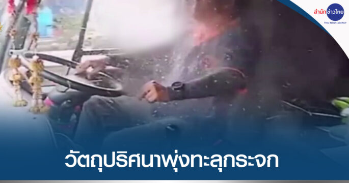 อุบัติเหตุระทึก กล้องหน้ารถจับภาพนาทีวัตถุปริศนาพุ่งทะลุกระจกรถ 6 ล้อ โดนศีรษะคนขับหมดสติ ทำให้รถเสียหลักพุ่งตกข้างทางพังยับ คนขับเจ็บสาหัส