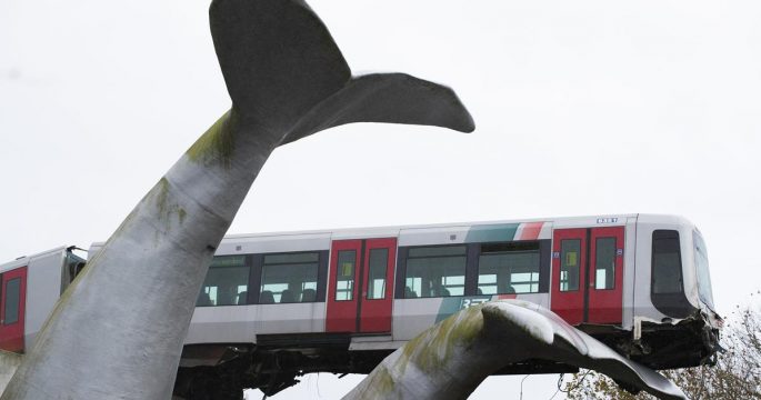 คนขับรถไฟฟ้าในเนเธอร์แลนด์รอดชีวิตอย่างปลอดภัย เมื่อขบวนรถพุ่งทะลุที่กั้นส่วนสุดท้ายของรางที่เป็นทางยกระดับ ตู้ขบวนแรกไปหยุดและค้างอยู่บนสถาปัตยกรรมรูปหางวาฬ