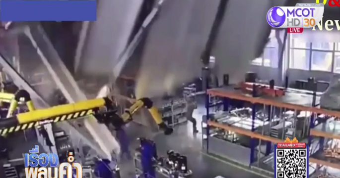 ภาพจากกล้องวงจรปิดภายในโรงงานแห่งหนึ่ง ในเมืองเซอร์ซินสกี นอกกรุงมอสโก ประเทศรัสเซีย เผยให้เห็นเจ้าหน้าที่ในชุดสีน้ำเงินหลายคน กำลังตรวจสอบความเรียบร้อยของเครื่องจักรภายในโรงงาน อยู่ๆไฟภายในโรงงานก็ดับมืดลง