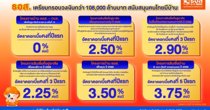 ธอส. เตรียมกรอบวงเงินกว่า 108,000 ล้านบาท สนับสนุนคนไทยมีบ้านเป็นของตนเอง จัดทำสินเชื่อบ้านอัตราดอกเบี้ยต่ำ เริ่มต้น 0% นาน 1 ปี
