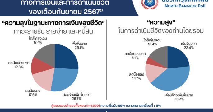 เปิดผลสำรวจ “ความสุขในฐานะทางการเงินของชีวิตคนไทย” เดือน ก.ย. 67 พบมีความสุขเพิ่มขึ้น 52.8% ตามภาวะเศรษฐกิจฟื้นหนุนสภาพคล่องการเงินดีขึ้น แถมความวุ่นวายทางการเมืองคลี่คลาย-ความขัดแย้งในสังคมลดลง