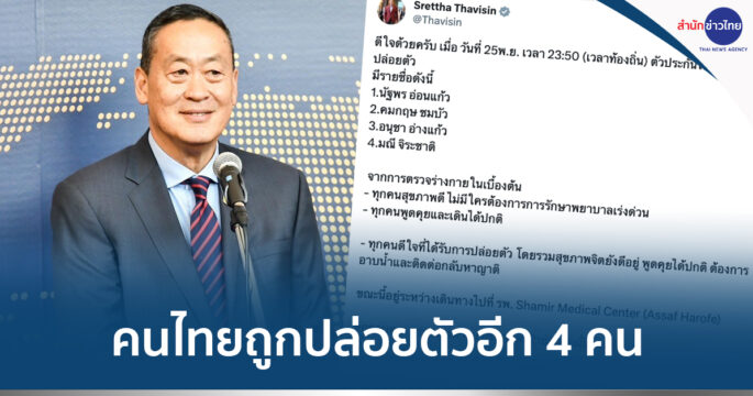 นายกฯ โพสต์แจ้งข่าวดี ฮามาสปล่อยตัวประกันลอตสอง มีคนไทยรวมอยู่ด้วย 4 คน เบื้องต้นทุกคนปลอดภัย พูดคุยได้ปกติ
