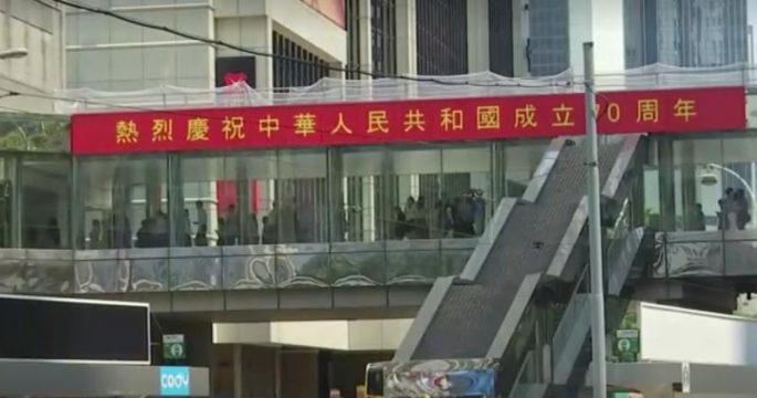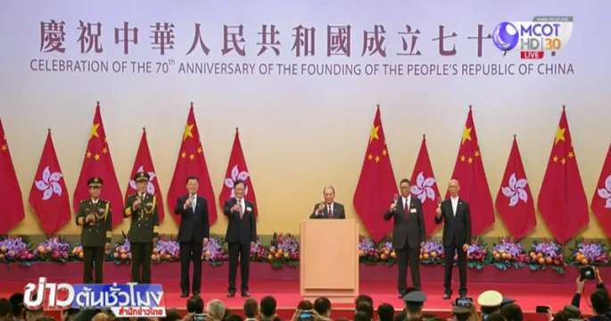 ฮ่องกงจัดงานฉลองวันชาติจีน วันนี้ โดยมีพิธีเชิญธงชาติจีนขึ้นสู่ยอดเสา บริเวณจัตุรัสหน้าศูนย์การประชุม ซึ่งปีนี้ทางการไม่อนุญาตให้ประชาชนเข้าร่วมในพิธี
