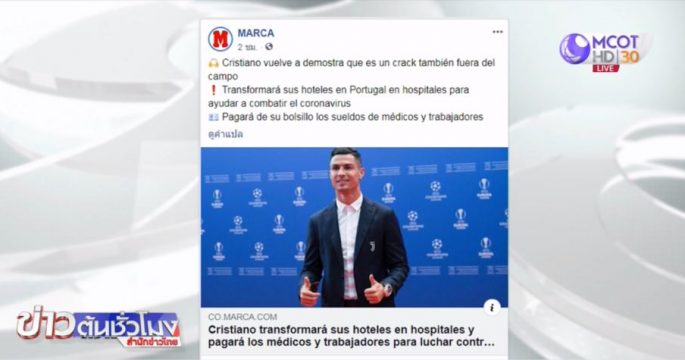 “คริสเตียโน โรนัลโด” นักเตะดังชาวโปรตุเกส เสียสละโรงแรมของตนเอง ปรับให้เป็นโรงพยาบาลชั่วคราว เพื่อรองรับผู้ป่วยโควิด-19 ซึ่งเขาจะเป็นคนออกค่าใช้จ่ายทั้งหมดให้แพทย์ พยาบาล และคนไข้ ที่เข้ามารักษาตัวที่นี่ด้วย