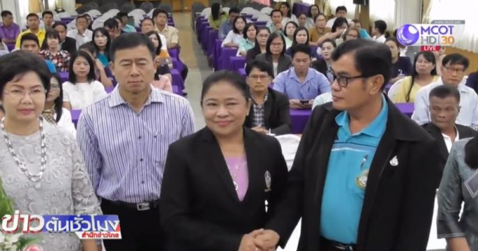 ครูและบุคลากรทางการศึกษารวมตัวนำแจกันดอกไม้ไปมอบให้ ผอ.สพป.ชัยนาท เพื่อให้กำลังใจ กรณีเซ็นคำสั่งย้ายครูสาวที่แฉประเด็นอาหารกลางวันโรงเรียน จนถูกมือมืดปาถุงเลือดหมูสดใส่หน้าห้องเรียน