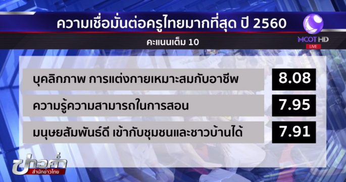 เนื่องในโอกาสวันครูแห่งชาติ 16 มกราคมของทุกปี สวนดุสิตโพลจัดทำดัชนี “ความเชื่อมั่นครูไทย” ประจำปี 2560 พบว่าประชาชนเชื่อมั่นครูสูงสุดเรื่อง บุคลิกภาพและการแต่งกายเหมาะสมกับอาชีพ ส่วนความเชื่อมั่นน้อยที่สุด คือ การไม่เป็นหนี้