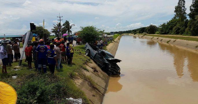 รถกระบะชนกันอย่างแรงเส้นทางกาญจนบุรีจนอีกคันกระเด็นตกคลองชลประทานพบสามีภรรยาเจ้าของไร่แตงโมเสียชีวิต พร้อมลูกชาย 17 ปี และยังมีผู้บาดเจ็บอีก 3