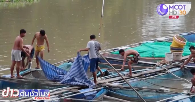 ผู้เลี้ยงปลากระชังคลองโผงเผง เร่งช้อนปลาในกระชังที่ขาดออกซิเจน น็อกน้ำลอยตายเป็นจำนวนมาก ออกจากกระชัง เพื่อลดความเสียหายหลังระดับน้ำในคลองโผงเผงลดลงอย่างรวดเร็ว