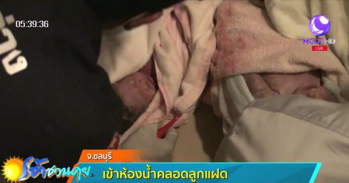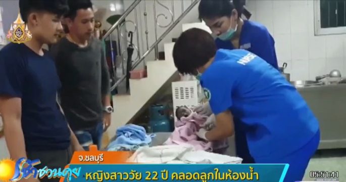 สาวชาวลาววัย 22 ปี ลูกจ้างร้านก๋วยเตี๋ยวที่ อ.บ้านบึง จ.ชลบุรี ปวดท้องอยากเข้าห้องน้ำ แต่เกิดคลอดลูกกะทันหันในห้องน้ำ แจ้งนายจ้างเรียกกู้ภัยช่วย เด็กปลอดภัย เป็นผู้หญิง น้ำหนัก 2,300 กรัม