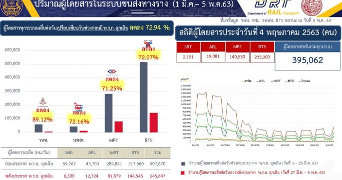 กรมรางฯ ขอประชาชนวางแผน-เผื่อเวลาเดินทางในวันทำงานพรุ่งนี้ หลังสถิติการเดินทาง 4 พ.ค.ที่ผ่านมา ประชาชนใช้บริการรถไฟฟ้าขนส่งใน กทม. เกือบ 400,000 คน/วัน เพิ่มขึ้น 100% จากช่วงต้นเดือน