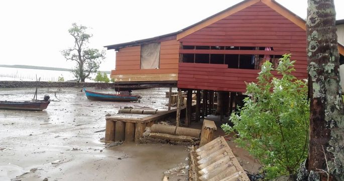 ระนองฝนตกหนัก คลื่นลมแรงซัดเรือประมงจอดชายฝั่งเกาะคณฑีเสียหายนับสิบลำ น้ำทะเลหนุนเข้าบ้านเรือน
